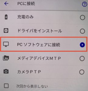 AndroidをPCに接続し、Androidの画面に表示された「PCソフトウェアに接続」を選択します。