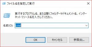 このような画面が表示されますので、「cmd」と入力し、OKを押すことでコマンドプロンプトを起動することができます。