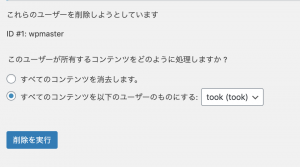 もし、すでに記事を投稿していた場合には、「すべてのコンテンツを以下のユーザーのものにする」を選択することで、新たに作成したユーザーに記事を引き継ぐことができます。