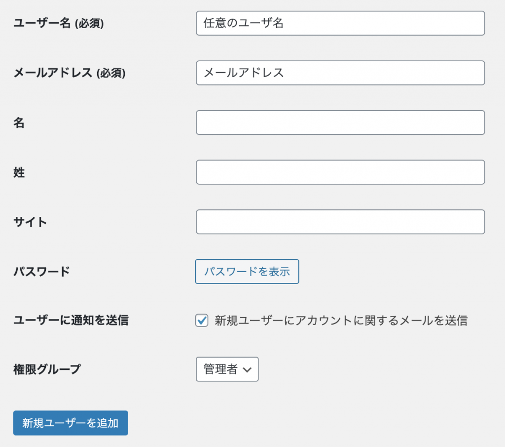 現在、使用しているwpmasterは後で削除してしまうため、新規で作成するアカウントを「管理者」に設定しましょう。