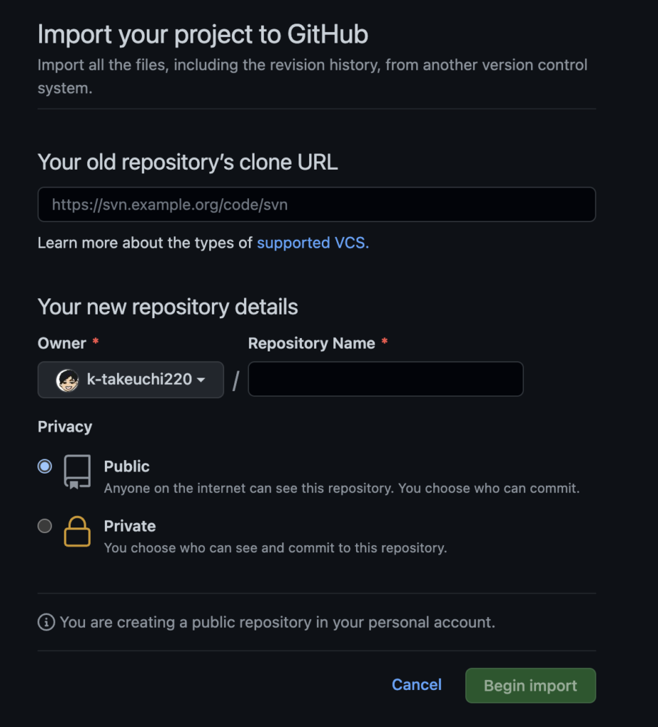 Your old repository`s clone URLに、複製元となるリポジトリのURLを入力。