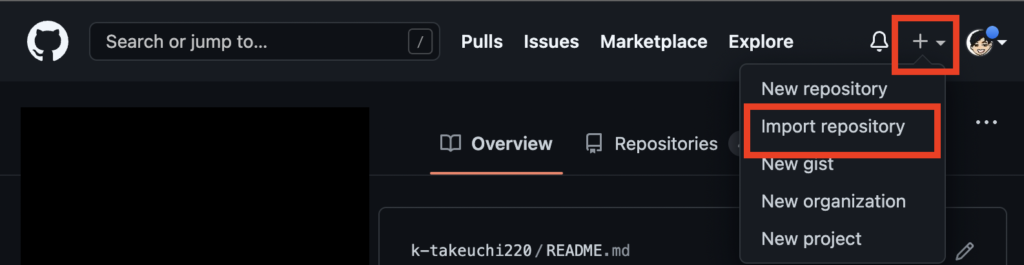 通常、リポジトリをforkする際には、以下の箇所から「Creare a new fork」から他のユーザのもつリポジトリをforkしますが、自身のリポジトリの場合は、ここから操作を行うことができないようです。