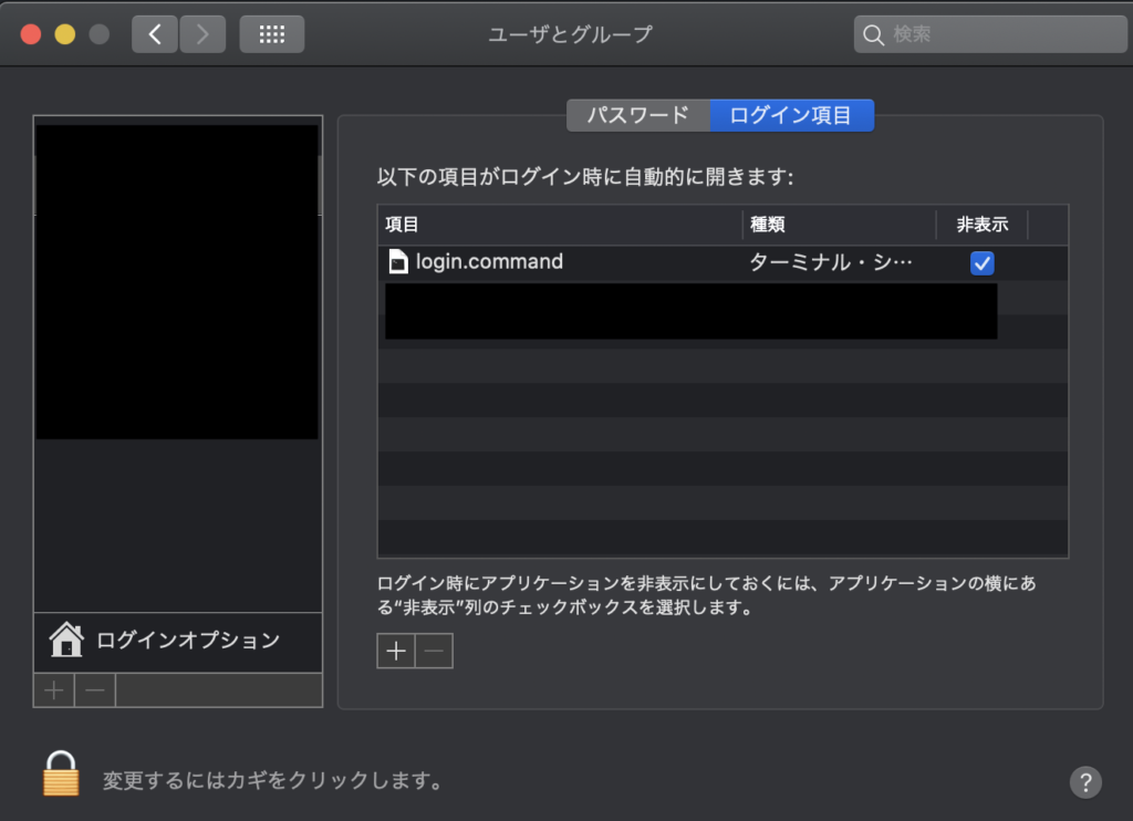 macのLogin Hookが動作しなかったため、システム環境設定より行えるログインオプションを使用します。