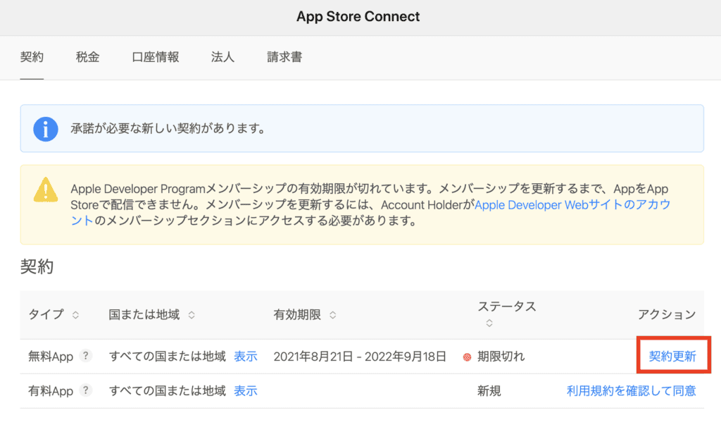 App Store Connectにログインし、契約タブに移動します。
