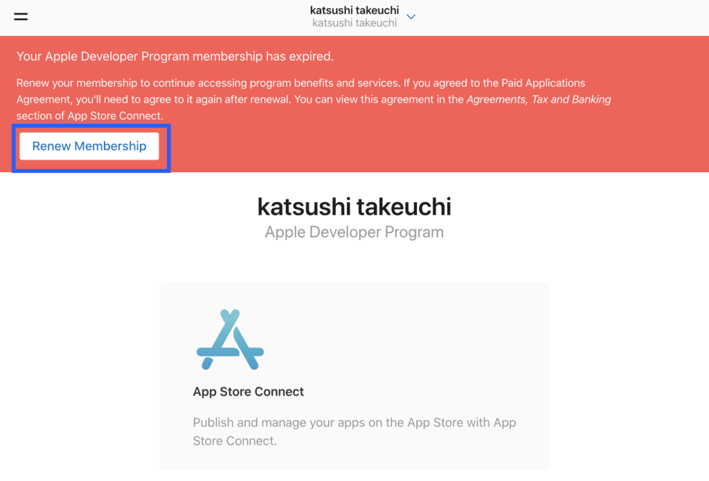 初めて見るステータスだったので、調べてみると、どうやらApp Store Connectの年会費を支払い忘れており、アプリの公開が停止されているようです。