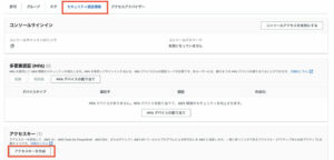 「セキュリティ認証情報」タブを選択し、「アクセスキーの作成」を押下します。