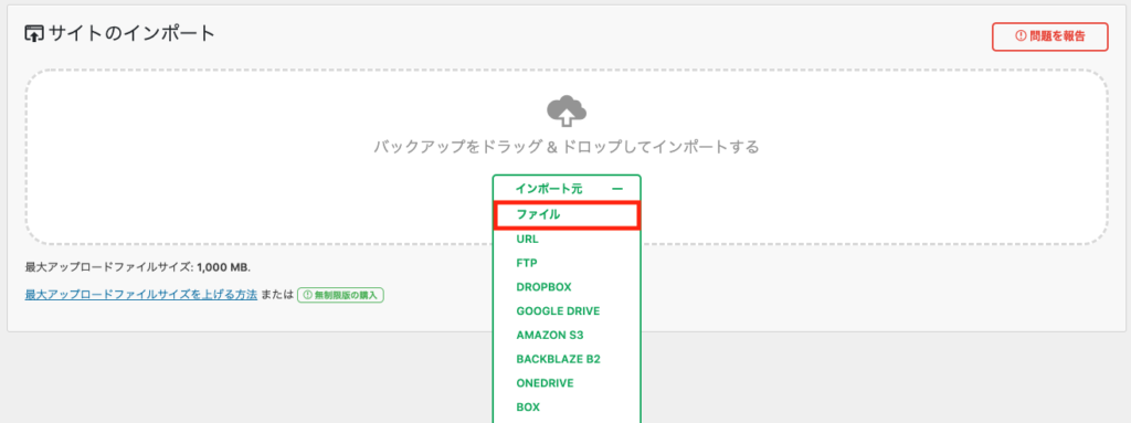 インポート先から「ファイル」を選択し、移行元サイトより取得した「wpress」拡張子のファイルを選択します。